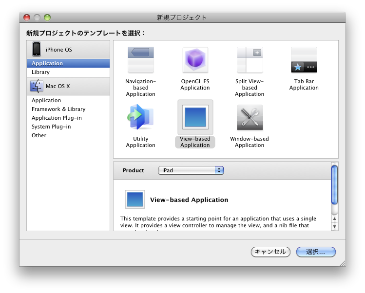 iPhone OS の Application で、View-based Application を選択し、Product が iPad になっているのを確認して「選択...」ボタンを押します。
